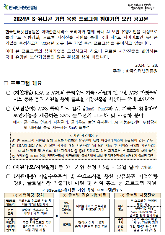 [KISA Çѱ¹ÀÎÅͳÝÁøÈï¿ø] 2024³â S-À¯´ÏÄÜ ±â¾÷ À°¼º ÇÁ·Î±×·¥ Âü¿©±â¾÷ ¸ðÁý°ø°í